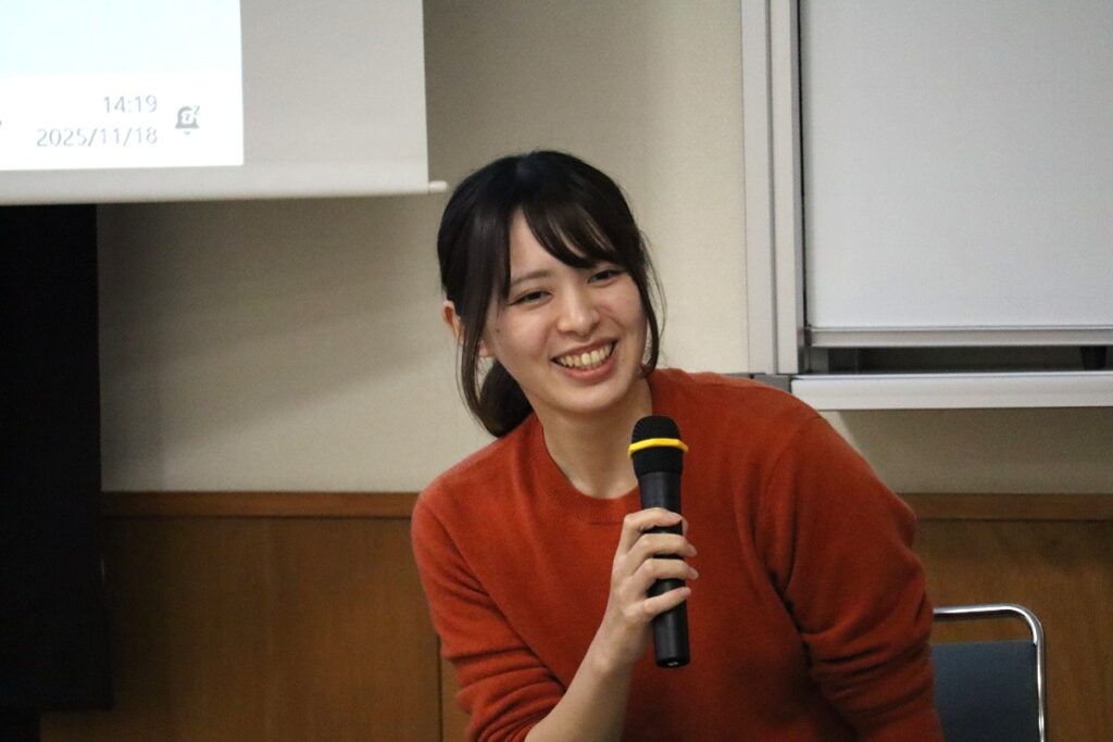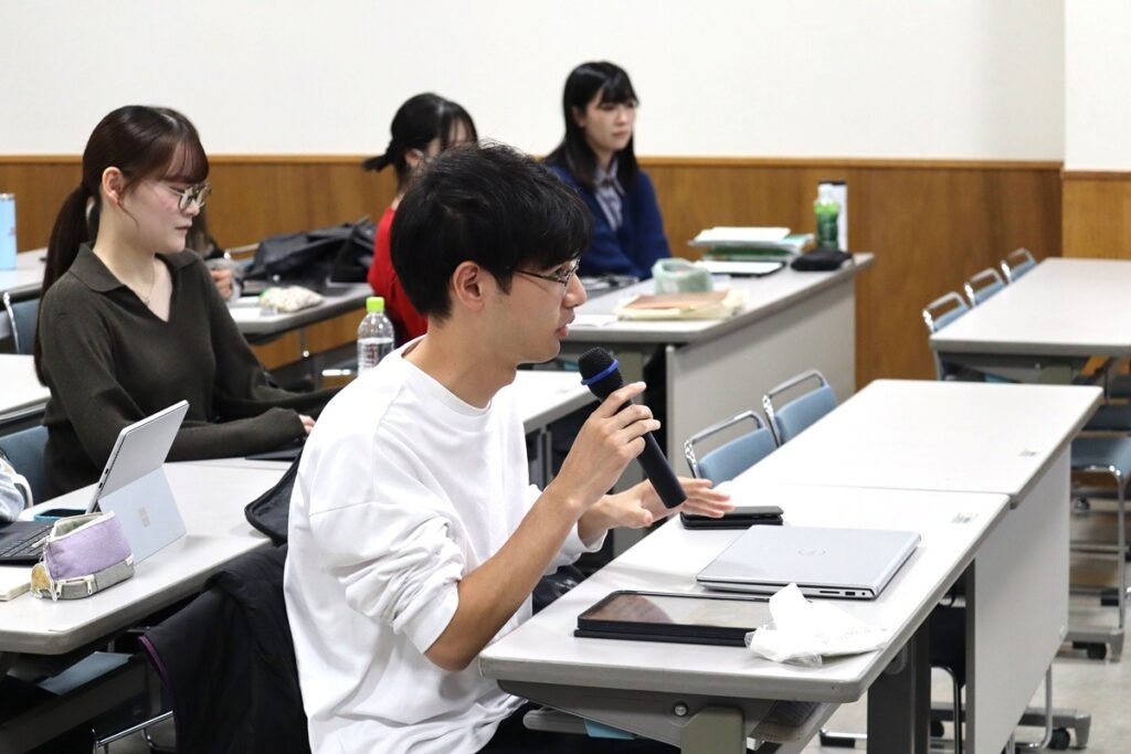 また、11月18日には、同じく宇土市立鶴城中学校の松島裕美養護教諭、橋口真人スクールカウンセラー、そして本学の卒業生でもある小松加奈スクールソーシャルワーカーにお越しいただき、それそれの立場から学校現場の多職種協働についてお話をいただきました。鶴城中学校はスクールソーシャルワーカーを保健室に配置し、先駆的に多職種協働に取り組んでいます。