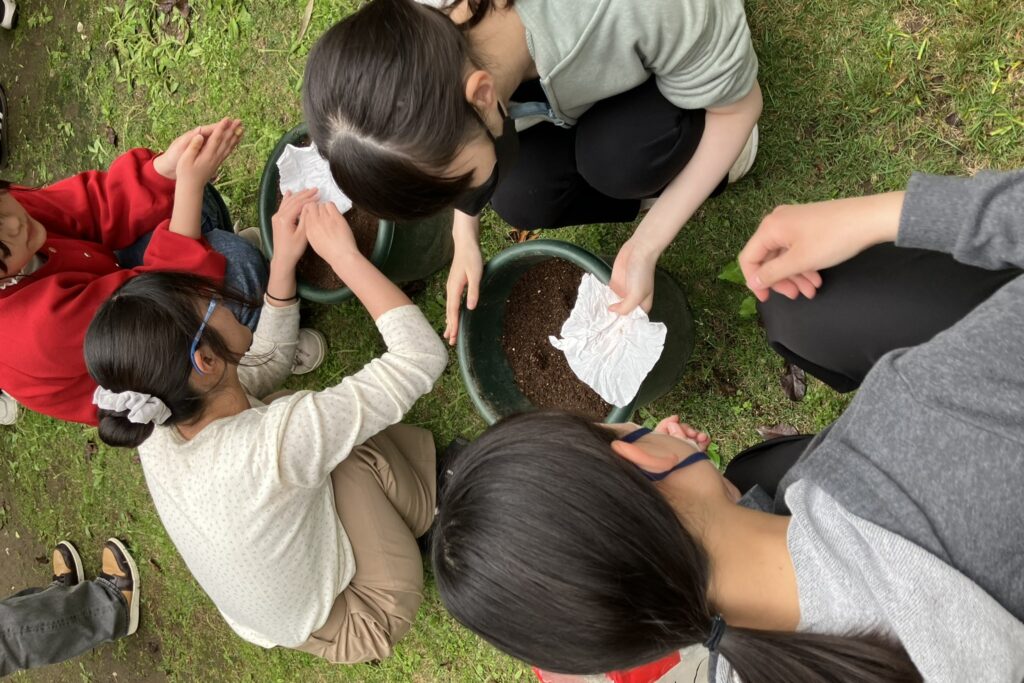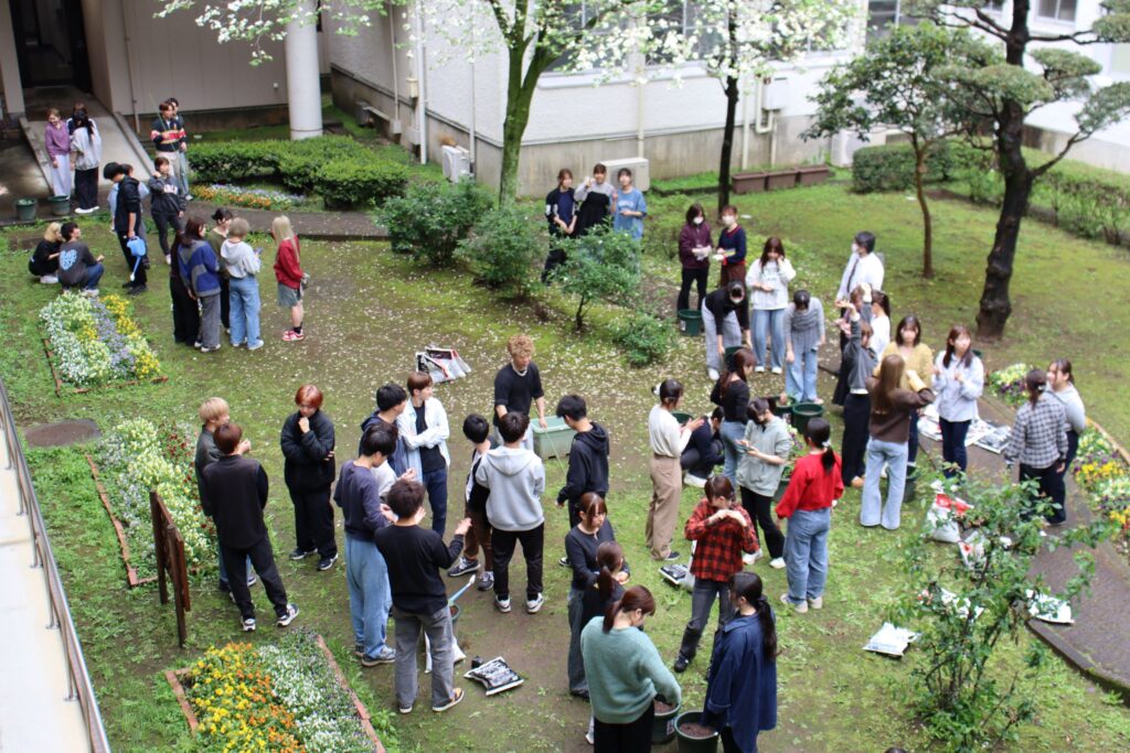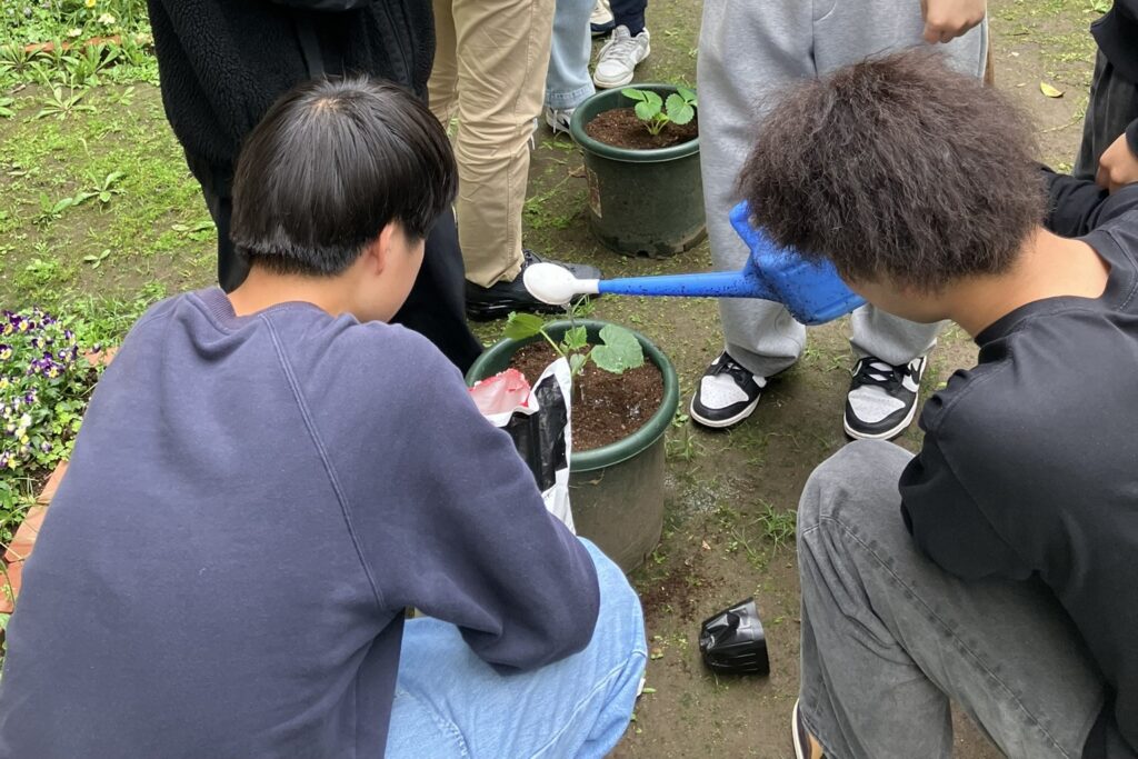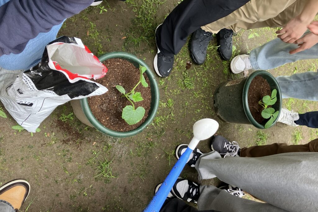 学生たちは思い思いの場所に置いた植木鉢を囲み、土に触れ、ひまわりやマリーゴールド、大葉など、さまざまな植物の栽培に取り組みます。鉢植えの土や種まきの方法等、互いに声を掛け合う姿が印象的でした。