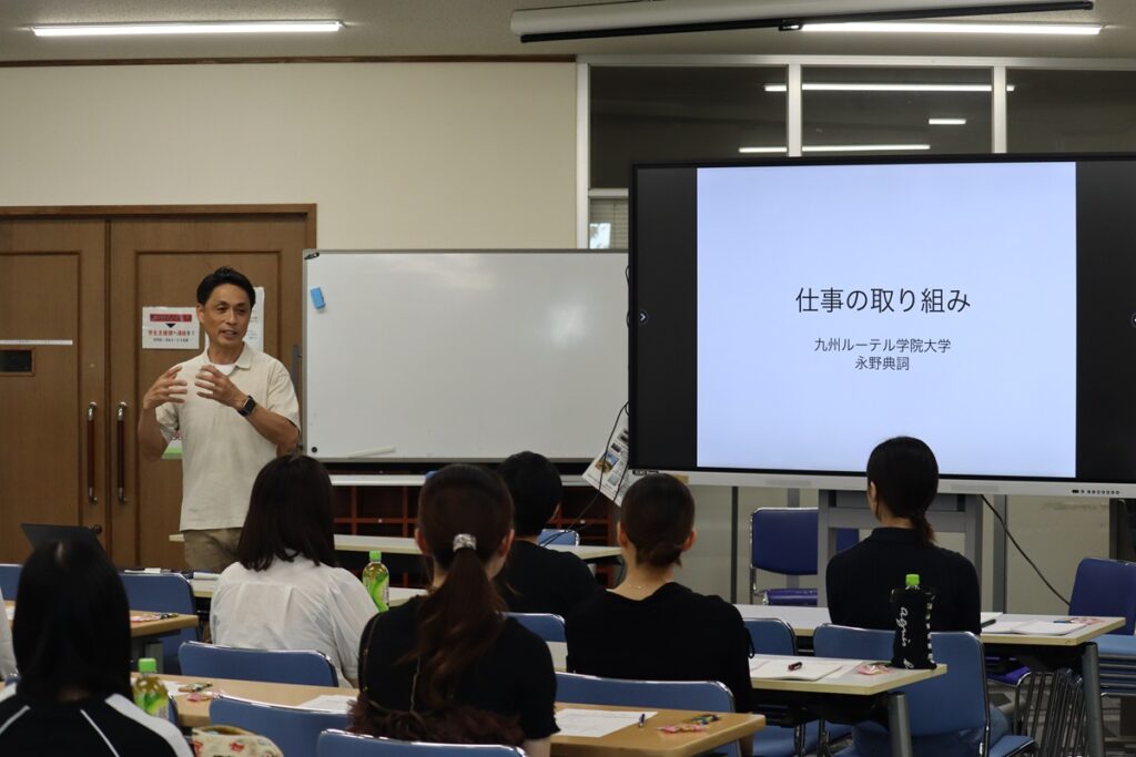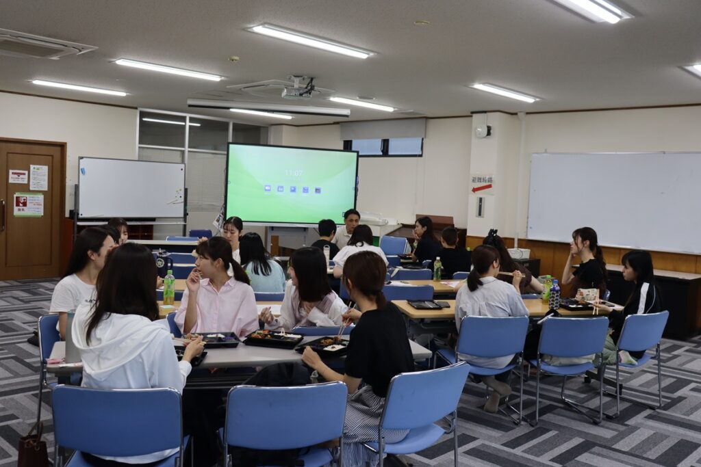 今回参加した17名の卒業生は、幼稚園・保育園・認定こども園、病院、銀行などで活躍中。本学人文学部永野教授による講義の後は、専攻教員との懇談会を兼ねたランチ交流会が行われ、現場での悩みや喜びを共有する貴重な時間となりました。