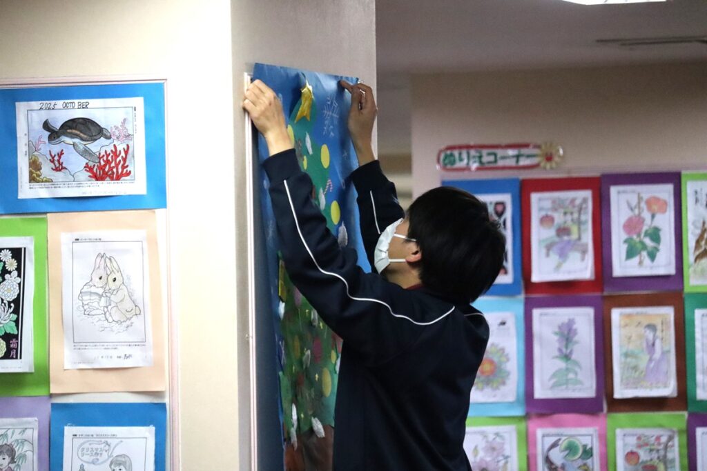 壁面には、スパッタリングの技法を用いて作成した模造紙の壁面構成作品なども貼りました。デイケアセンターを訪れた方々も、当飾り付けを鑑賞され、大変喜んでおられました。