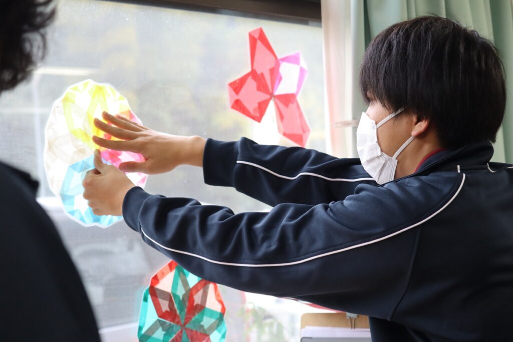窓ガラスに貼った作品はトランスパレント紙を用いて折った作品です。今回はラミネート加工をして貼りました。トランスパレント紙とは「艶と張りのある半透明の紙」です。通常の折紙とは違い、窓ガラス等に貼って、差し込む太陽の光で輝く色を楽しむことができます。色とりどりの星や花の折紙作品が部屋を明るい雰囲気にしてくれます。