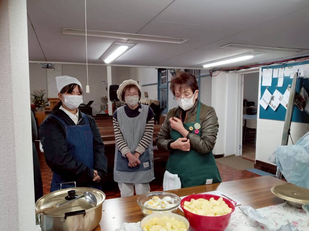 また、熊本聖書教会で実施されている「元気だモン食堂」には、継続して本学の学生がボランティアとして参加しており、今回も2名の学生が活動に加わりました。当日のメニューは、ハヤシライス、大根サラダ、ふかし芋、フルーツポンチでした。